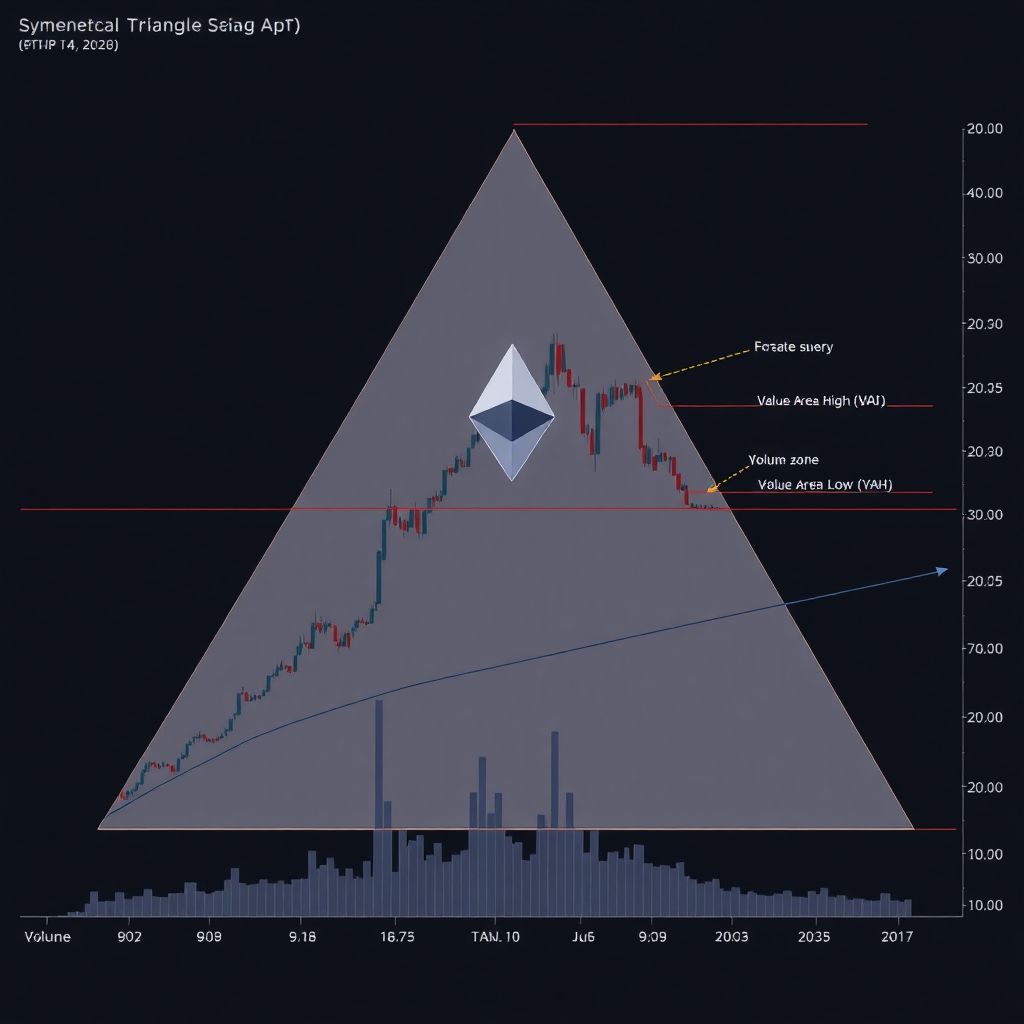 Liquidity dynamics play a significant role in what happens after the breakout. Once ETH escapes the confines of the triangle, price is statistically likely to be drawn toward the next major volume node or value area boundary. If the breakout is upward and accepted above the POC, the VAH becomes a natural magnet as traders and algorithms target the next area where heavy participation previously occurred. If the breakout is downward, the VAL takes on that role, potentially acting first as a target and then as a decision point: either as support where buyers step in, or as a launchpad for further downside if it fails.
